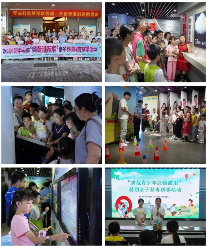 广东省中山市禁毒办联合中山科学馆在中山市禁毒教育基地举办暑期亲子研学活动。在讲解员的带领下,亲子家庭有序参观基地各板块,倾听讲解员的介绍,观看动画视频,体验禁毒VR设备。活动中,戒毒康复人员阿明“现身说法”,以亲身经历向孩子们诉说毒品给自身、家庭及社会造成的巨大危害。活动现场还进行了“圈圈拒毒”游戏、禁毒知识有奖问答和“我是禁毒演说家”比赛,让“健康人生 绿色无毒”的禁毒理念深植于孩子们的心中。